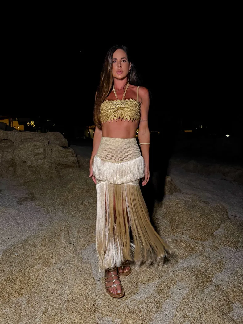 Saia confeccionada em tela crochet, barradas por franjas por toda sua circunferência. Fechamento por zíper invisível nas costas.