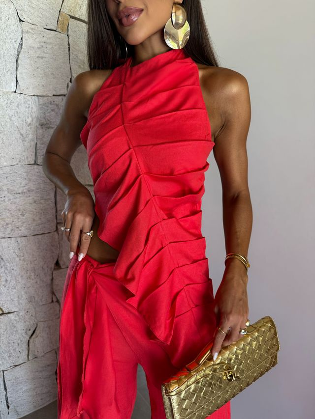 A parte superior traz uma gola halter com recorte lateral, evidenciando o design autoral e a construção tridimensional da peça. O busto não possui bojo, proporcionando um caimento leve e natural. A calça estilo wide leg possui amarração lateral, reforçando o efeito de conjunto e permitindo ajuste confortável na cintura. Fechamento posterior em zíper invisível.